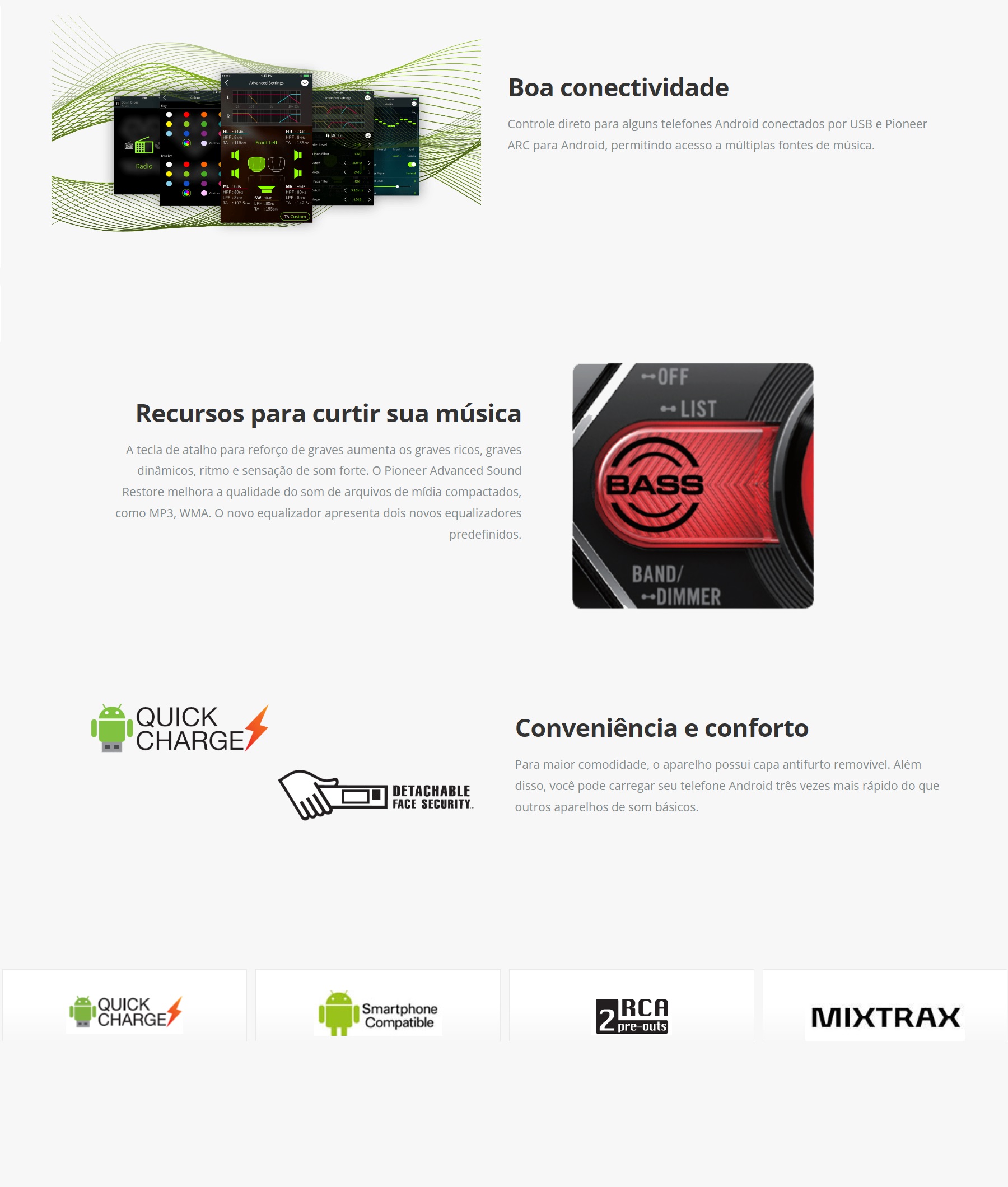 Face de controle anti-roubo removível - Advanced Sound Restorer - Bass Boost (hotkey) - Bass Auxiliary Control - MIXTRAX (MIXTRAX EZ para reprodução rápida e ininterrupta de mixagem)