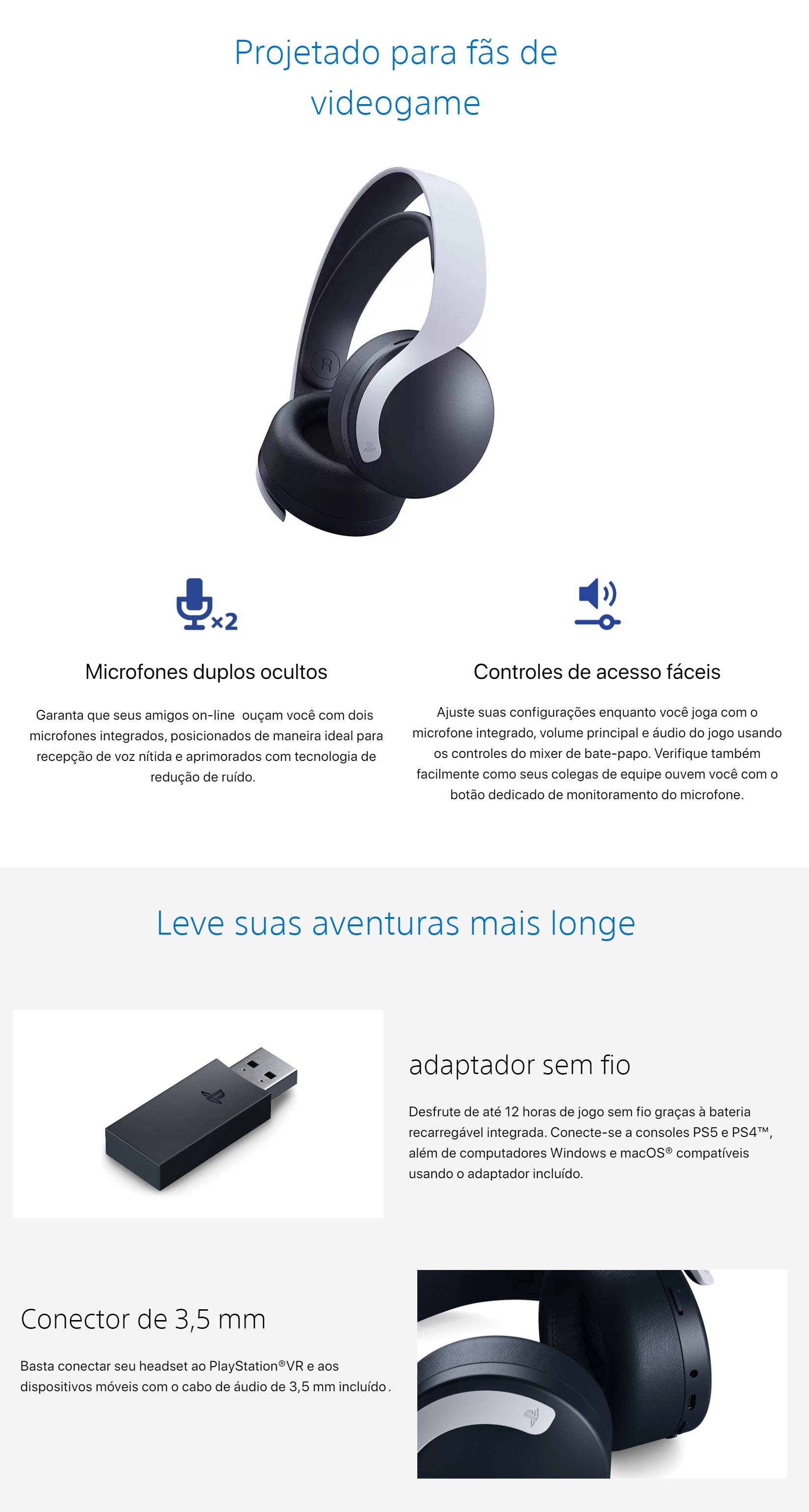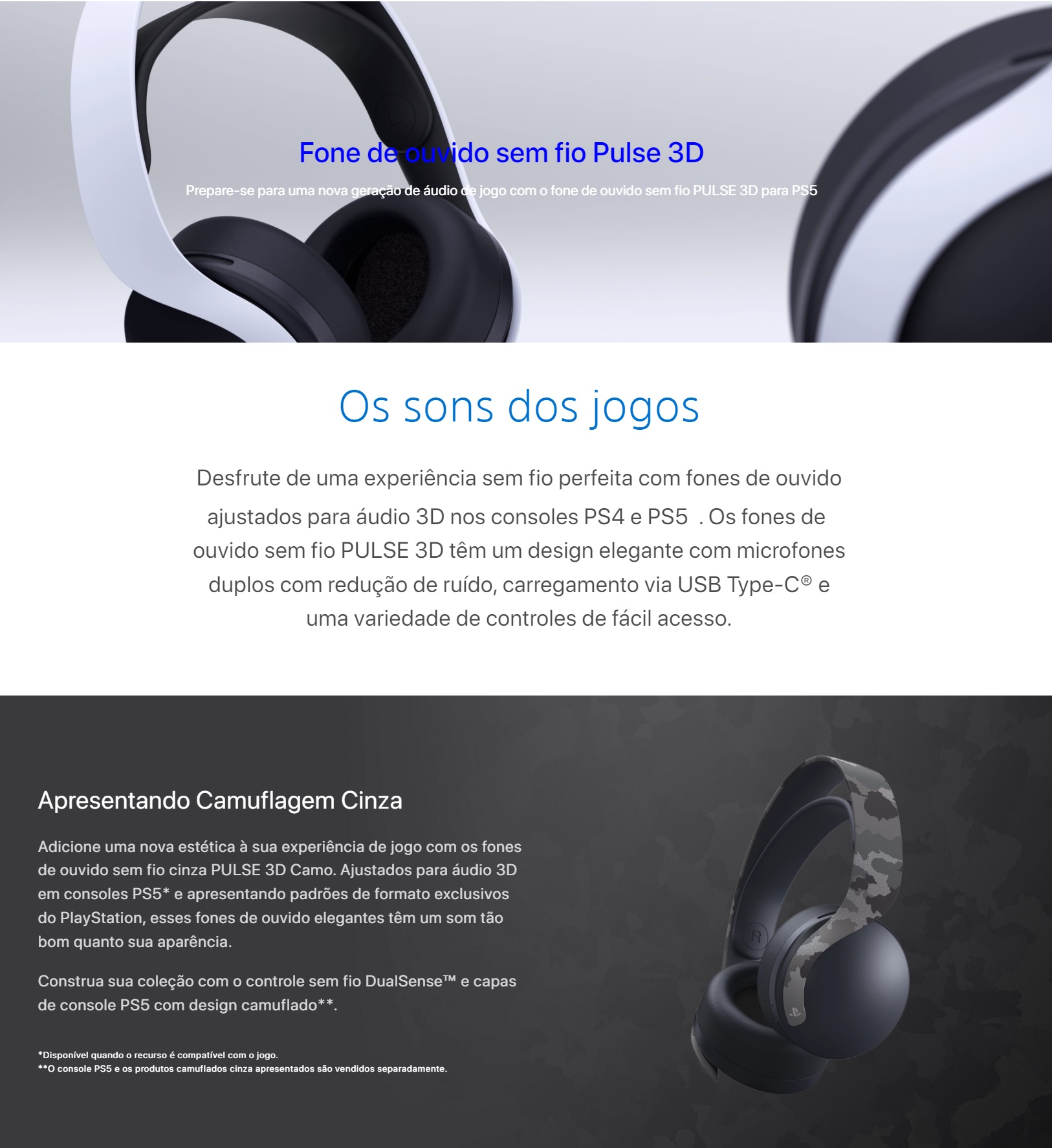 O fone de ouvido sem fio PULSE 3D foi ajustado especificamente para oferecer o áudio 3D possibilitado pelo console PlayStation®5.