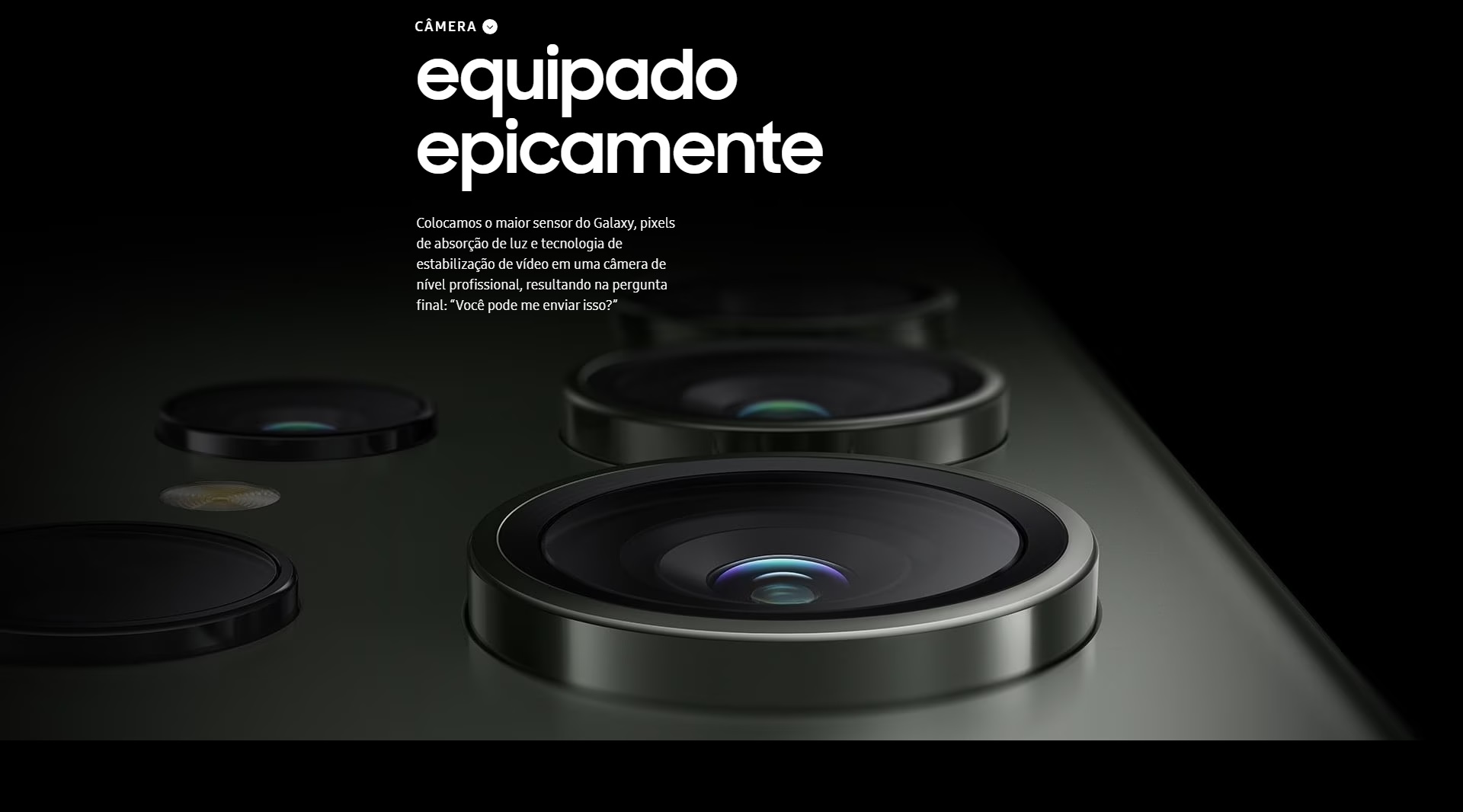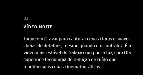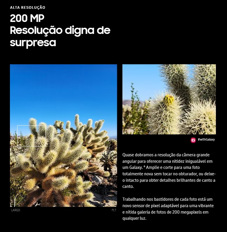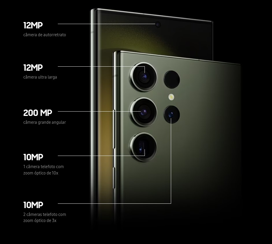 Câmera Principal200 MP, f/1.7, 23mm (wide), 1/1.3", 0.6µm, PDAF, Laser AF, OIS, 10 MP, f/4.9, 230mm (periscope telephoto), 1/3.52", 1.12µm, dual pixel PDAF, OIS, 10x optical zoom, 10 MP, f/2.4, 70mm (telephoto), 1/3.52", 1.12µm, dual pixel PDAF, OIS, 3x optical zoom, 12 MP, f/2.2, 13mm, 120˚ (ultrawide), 1/2.55", 1.4µm, dual pixel PDAF, LED flash, auto-HDR, panorama, Vídeo 8K@24/30fps, 4K@30/60fps, 1080p@30/60/240fps, 720p@960fps, HDR10+, stereo sound rec., gyro-EIS
