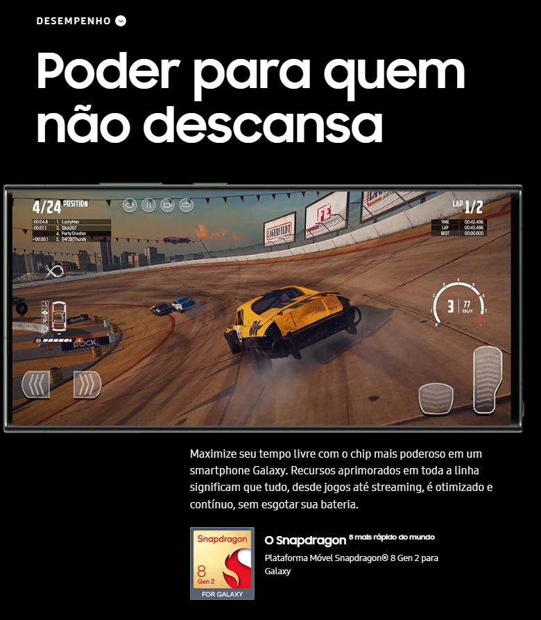 ProcessadorCPU Octa-core (1x3.36 GHz Cortex-X3 & 2x2.8 GHz Cortex-A715 & 2x2.8 GHz Cortex-A710 & 3x2.0 GHz Cortex-A510) - Chipset Qualcomm SM8550-AC Snapdragon 8 Gen 2 (4 nm) - GPU Adreno 740