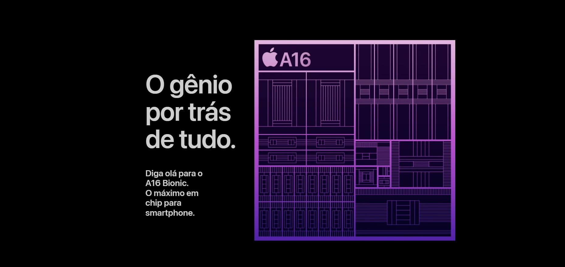 ProcessadorHexa-core (2x3.46 GHz Avalanche + 4x Blizzard) - Apple A16 Bionic (4 nm) - Apple GPU (5-core graphics)