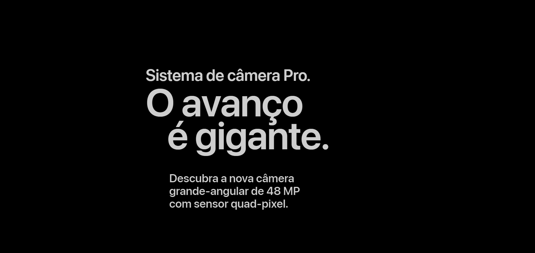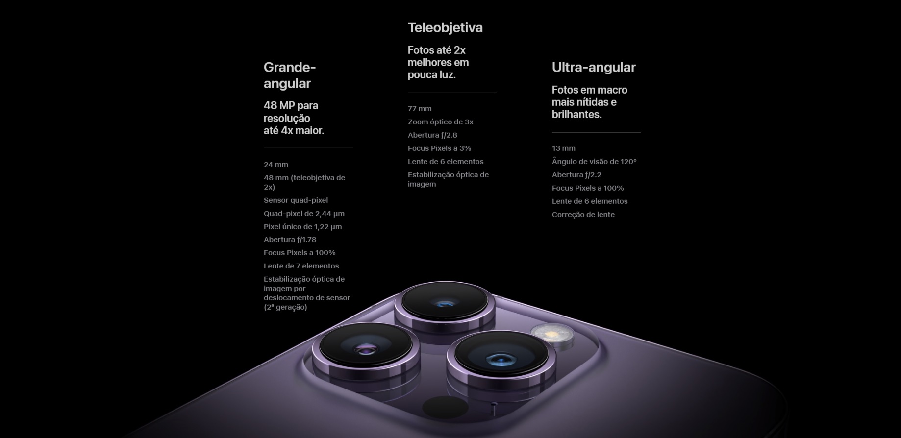 Câmera Principal48 MP, f/1.8, 24mm (wide), 1/1.28", 1.22µm, dual pixel PDAF, sensor-shift OIS, 12 MP, f/2.8, 77mm (telephoto), 1/3.5", PDAF, OIS, 3x optical zoom, 12 MP, f/2.2, 13mm, 120˚ (ultrawide), 1/2.55", 1.4µm, dual pixel PDAF, TOF 3D LiDAR scanner (depth), Dual-LED dual-tone flash, HDR (photo/panorama) - Vídeo 4K@24/25/30/60fps, 1080p@25/30/60/120/240fps, 10-bit HDR, Dolby Vision HDR (up to 60fps), ProRes, Cinematic mode (4K@24/30fps), stereo sound rec