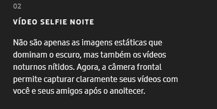 Câmera Secundaria12 MP, f/2.2, 25mm (wide), PDAF, Dual video call, Auto-HDR, HDR10+, Vídeo 4K@30/60fps, 1080p@30fps