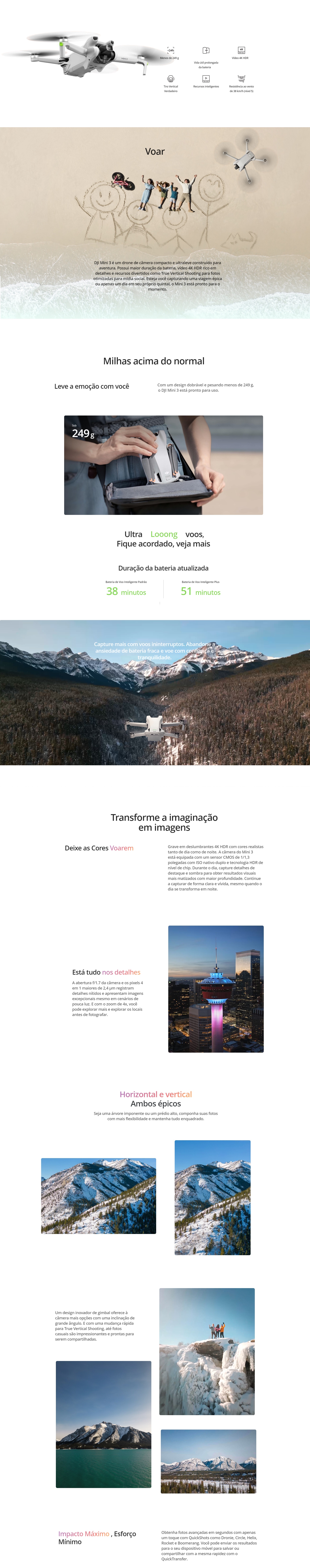 Tempo máximo de vooAté 38 minutos - 51 minutos (com Intelligent Flight Battery Plus) - Flutuação máxima: 33 minutos - 44 minutos (com Intelligent Flight Battery Plus)