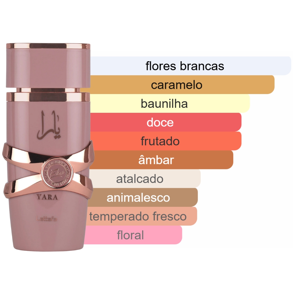O Frasco: O frasco do Yara Elixir mantém a elegância do clássico e icônico Yara, mas com um tom rosa mais profundo e detalhes dourados que lhe conferem um ar mais sofisticado e sensual. Seu design cilíndrico com um anel metálico tem um aspecto moderno e feminino. É um frasco que reflete doçura, luxo e a evolução de uma fragrância já lendária.