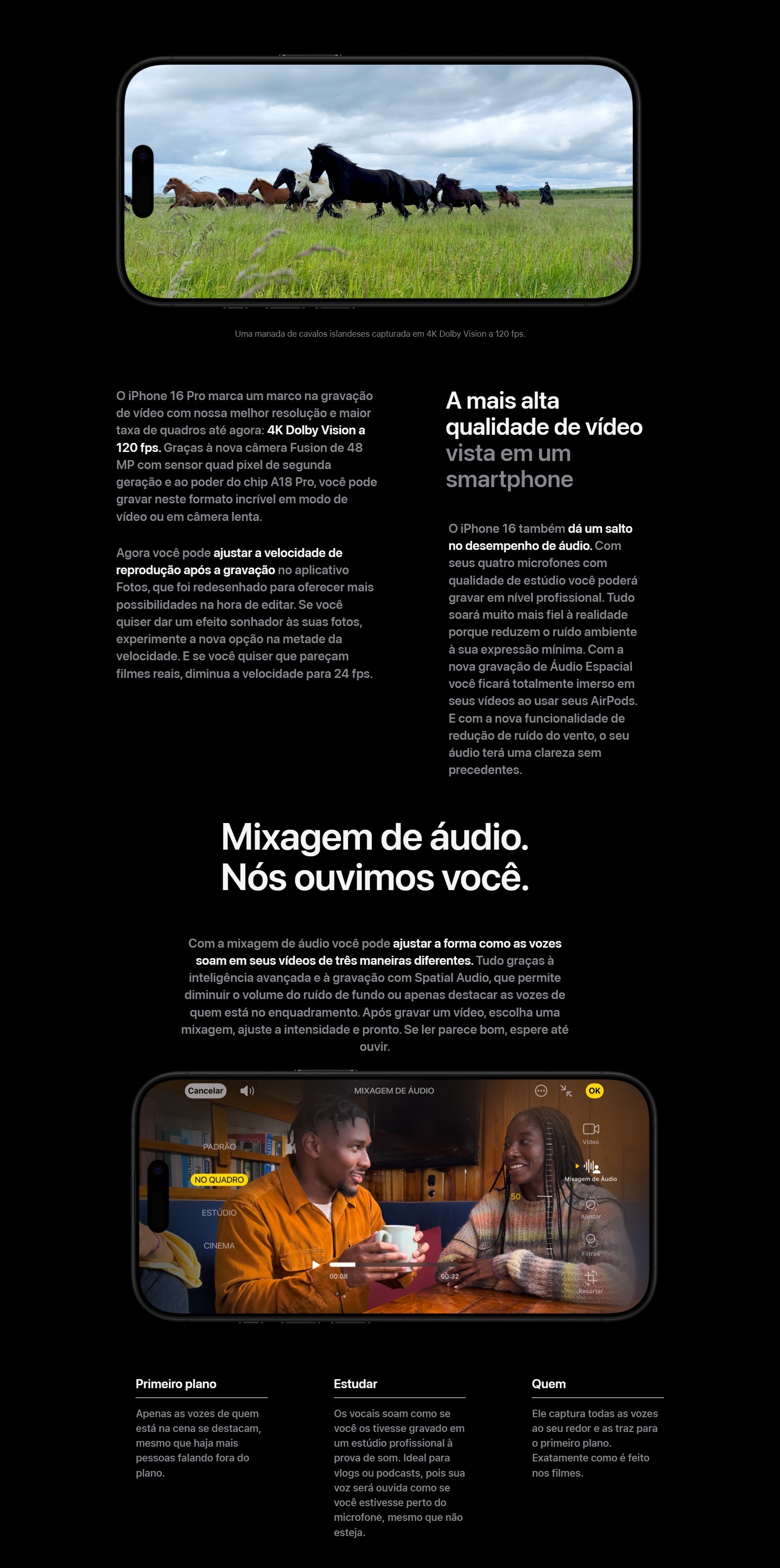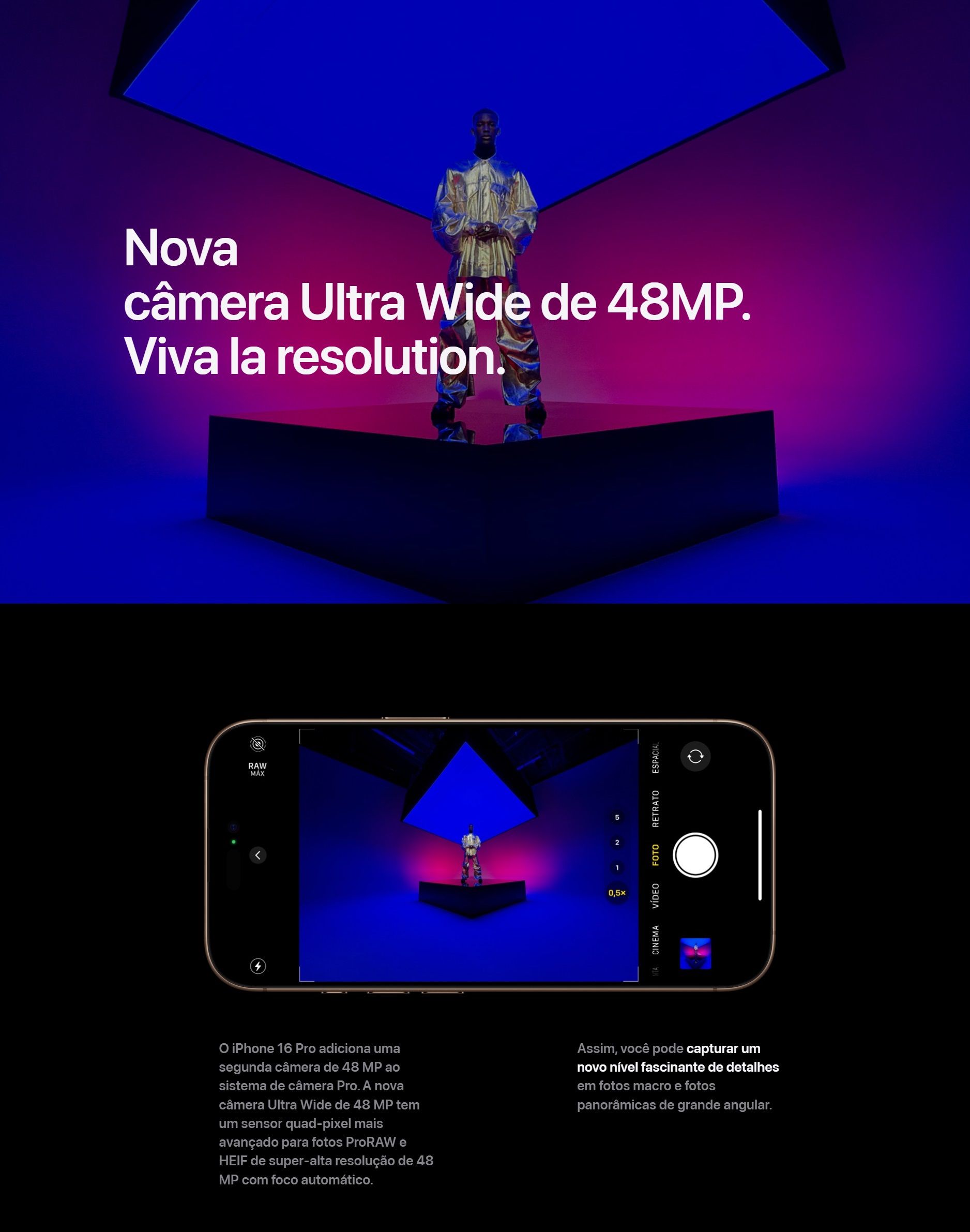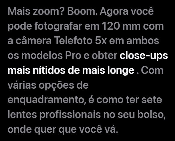 Câmera Principal48 MP, f/1.8, 24mm (wide), 1/1.28", 1.22µm, dual pixel PDAF, sensor-shift OIS - 12 MP, f/2.8, 120mm (periscope telephoto), 1/3.06", 1.12µm, dual pixel PDAF, 3D sensor‑shift OIS, 5x optical zoom - 48 MP, f/2.2, 13mm (ultrawide), 0.7µm, PDAF, TOF 3D LiDAR scanner (depth), Dual-LED dual-tone flash, HDR (photo/panorama) - Vídeo 4K@24/25/30/60/100/120fps, 1080p@25/30/60/120/240fps, 10-bit HDR, Dolby Vision HDR (up to 60fps), ProRes, 3D (spatial) video/audio, stereo sound rec