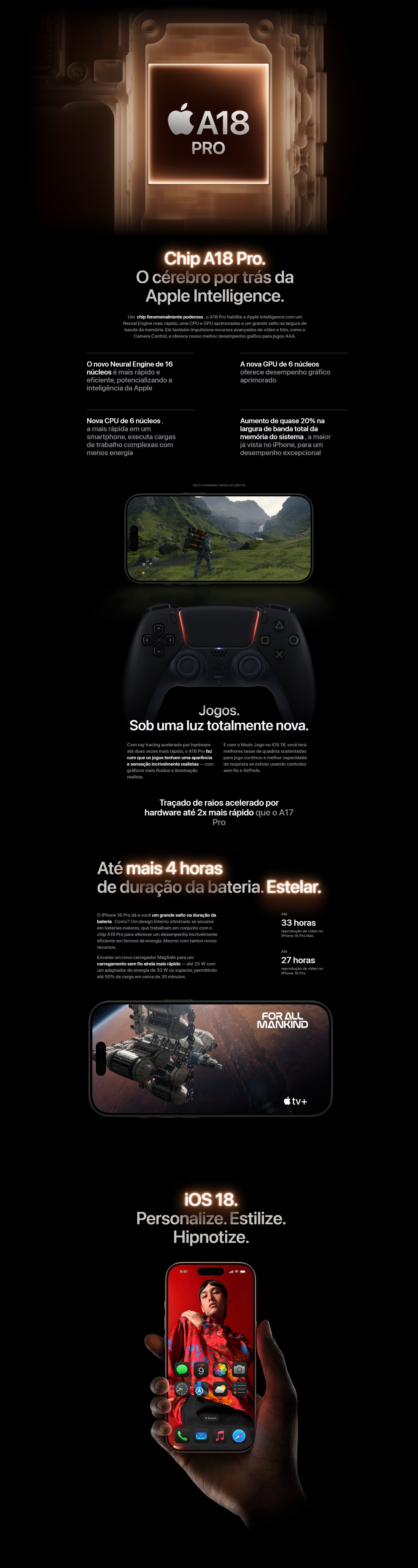 ProcessadorCPU Hexa-core (2x4.04 GHz + 4x2.X GHz) - Chipset Apple A18 Pro (3 nm) - Apple GPU (6-core graphics)